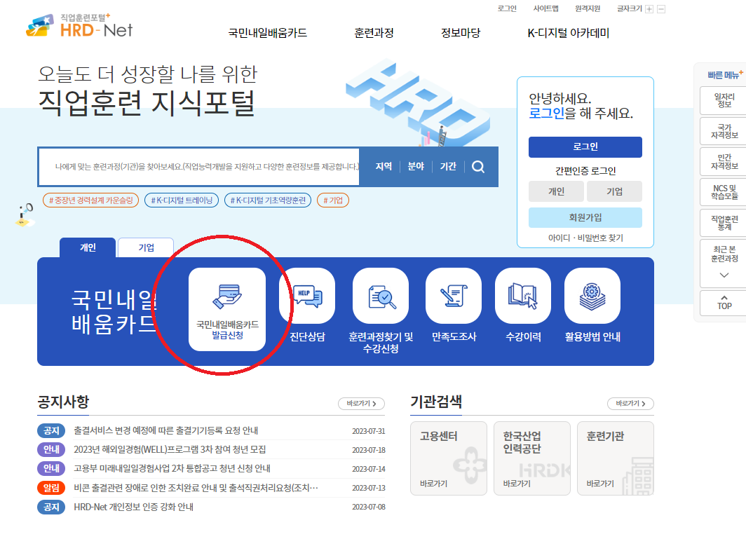 신청방법은 직업훈련포털인 HRD-NET 홈페이지에 접속해서 국민내일 배움 카드를 발급신청하거나 고용노동센터에서도 방문신청이 가능합니다.