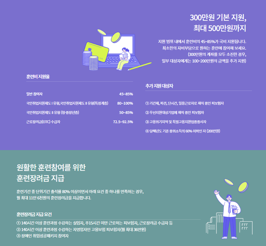 지원은 훈련비의 45~85%를 지원하며 한도는 300만 원부터 최대 500만 원까지 지원됩니다.