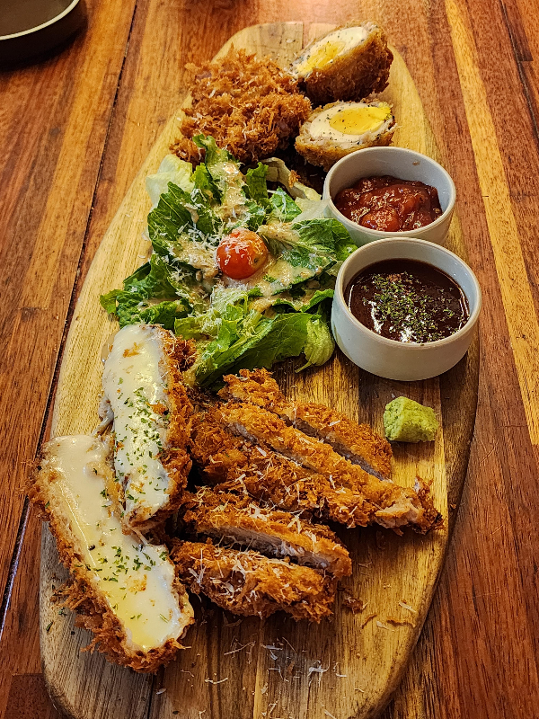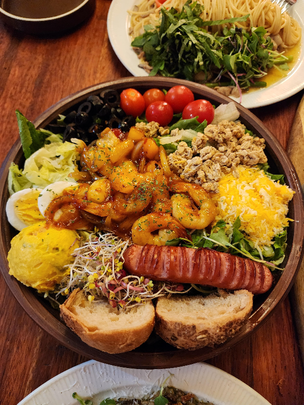 저희는 오늘 감동카츠와 시골 오일 파스타, 그리고 바질 스카치에그 크림파스타, 하와이안 칠리 쉬림프 샐러드볼, 수비드 등심 보리 리조토를 주문했어요.