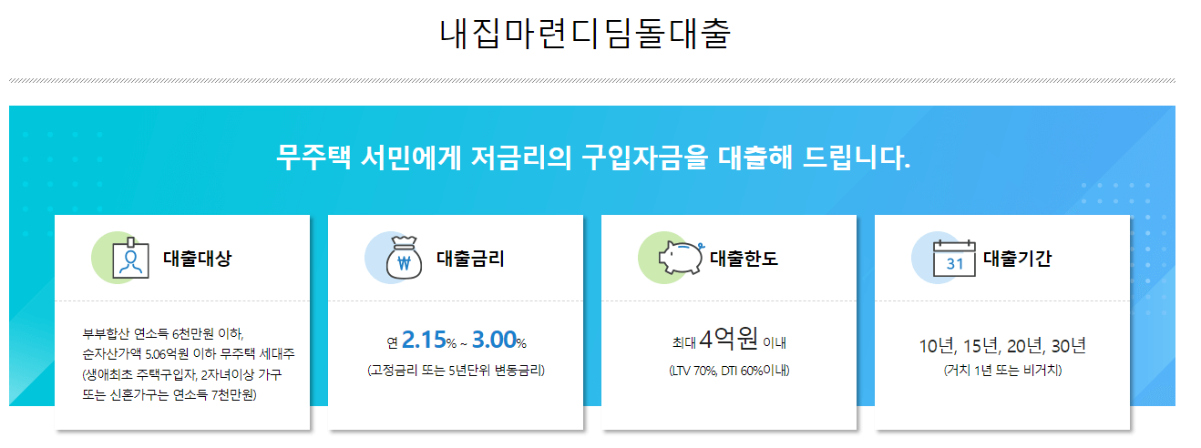 내 집마련 디딤돌 대출은 정부에서 운영하는 저금리 대출이며 주택 구입 시 받는 일종의 담보대출입니다.