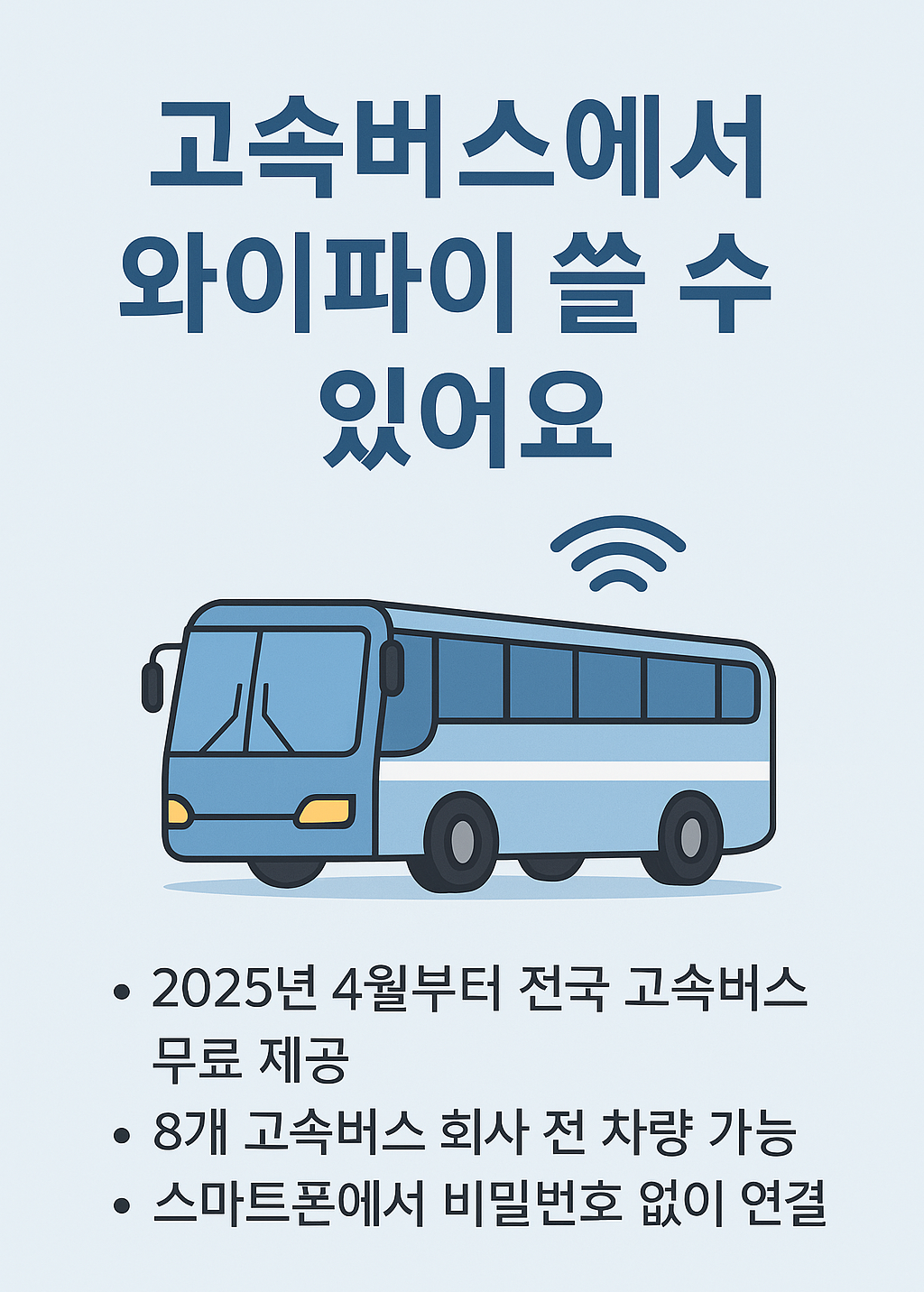 장거리 여행 중 스마트폰 데이터 걱정되셨죠? 이제 전국 8개 고속버스 회사의 모든 노선에서 무료 와이파이(Wi-Fi)를 사용할 수 있습니다. 비밀번호 없이 간단히 연결 가능하니 정말 편리해요!