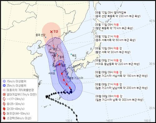 8일 오전 기상청에 의하면 10일 오전 9시 경남 통영 서쪽 30km 부근 해상까지 북상한 후 한반도에 상륙해 북서진을 거듭하면서 11일 오전 9시 북한 평양 북동쪽 70km 지점으로 이른다고 합니다.