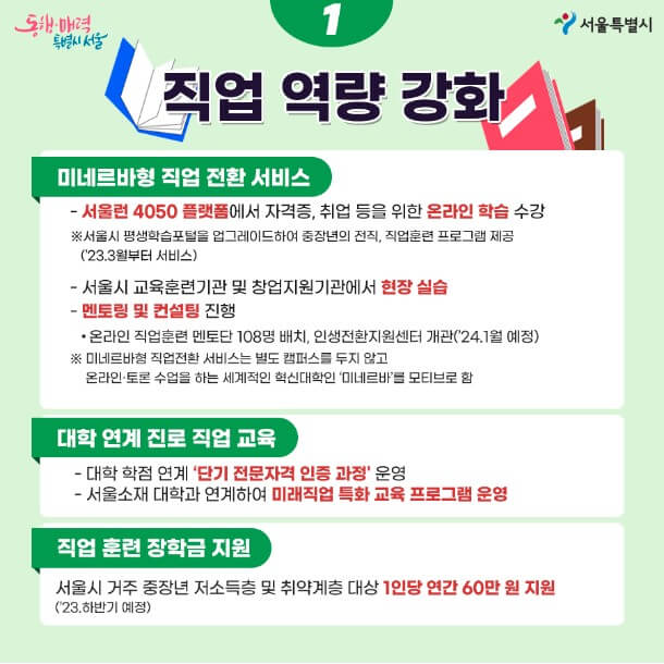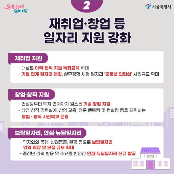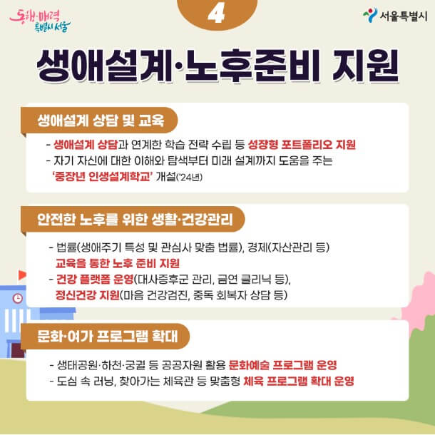 서울시 인구의 가장 큰 비중을 차지하는 중장년층을 위한 집중 프로젝트를 시작하며 가족 부양과 노후준비, 빨라지는 퇴직으로 인한 창업이나 재취업의 고민이 많은 중장년을 응원합니다.
