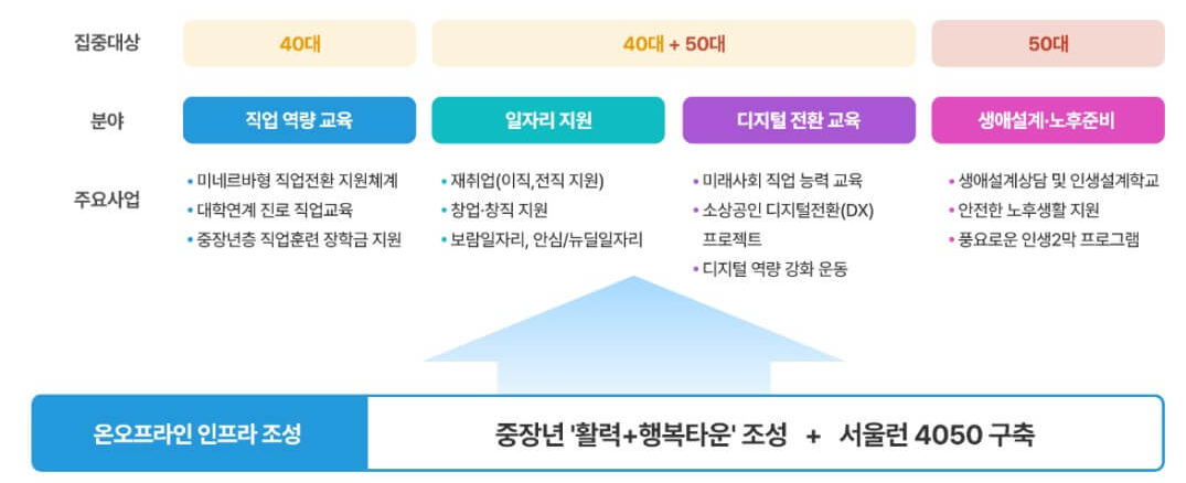 - 5개 분야, 48개 사업으로 구성되며 직업역량 강화, 일자리 지원, 디지털 전환 교육, 생애설계와 노후준비등 40~50대 연령대별 맞춤프로그램을 지원합니다.